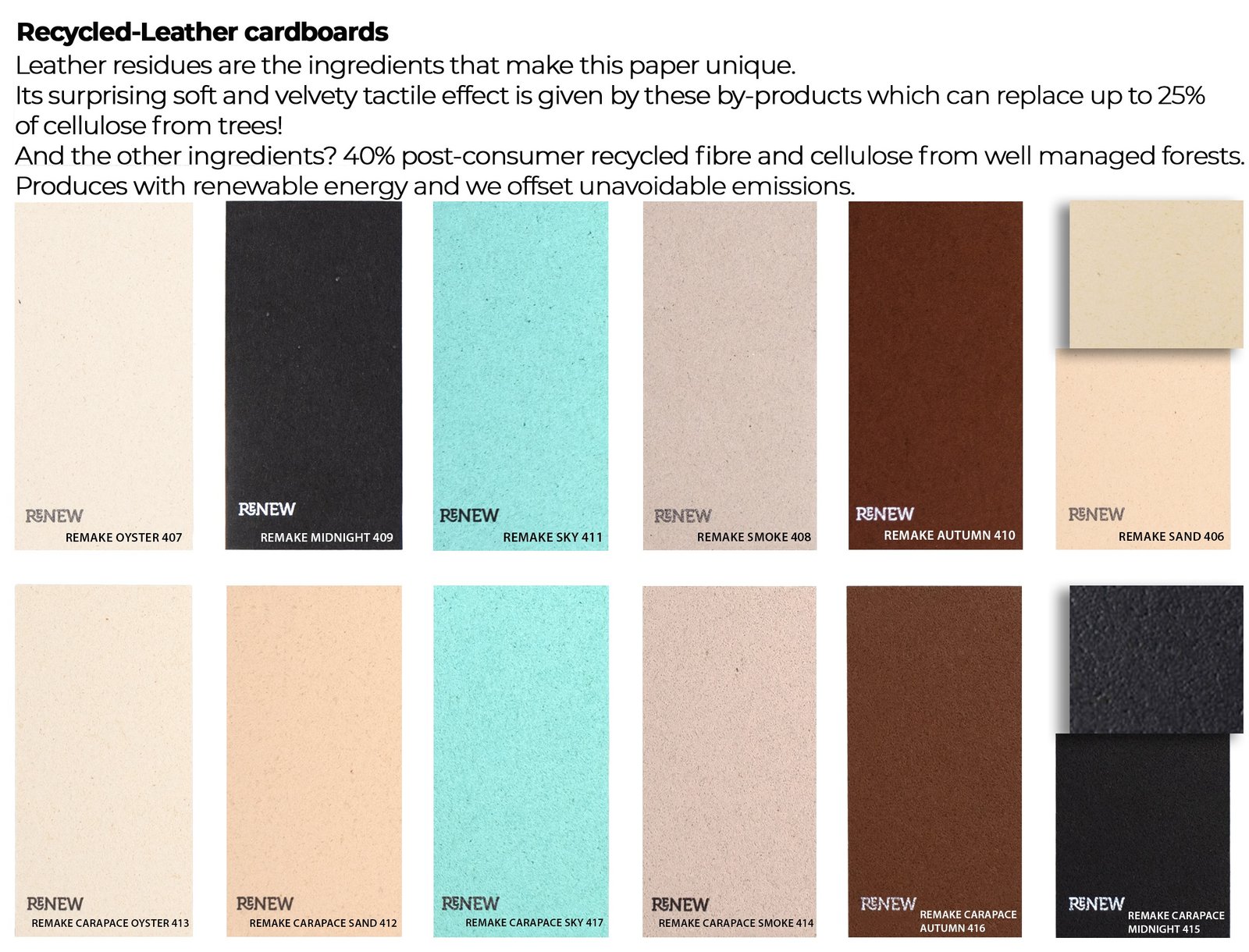 Leather residues are the ingredients that make this paper unique. Its surprising soft and velvety tactile effect is given by these by-products which can replace up to 25% of cellulose from trees!