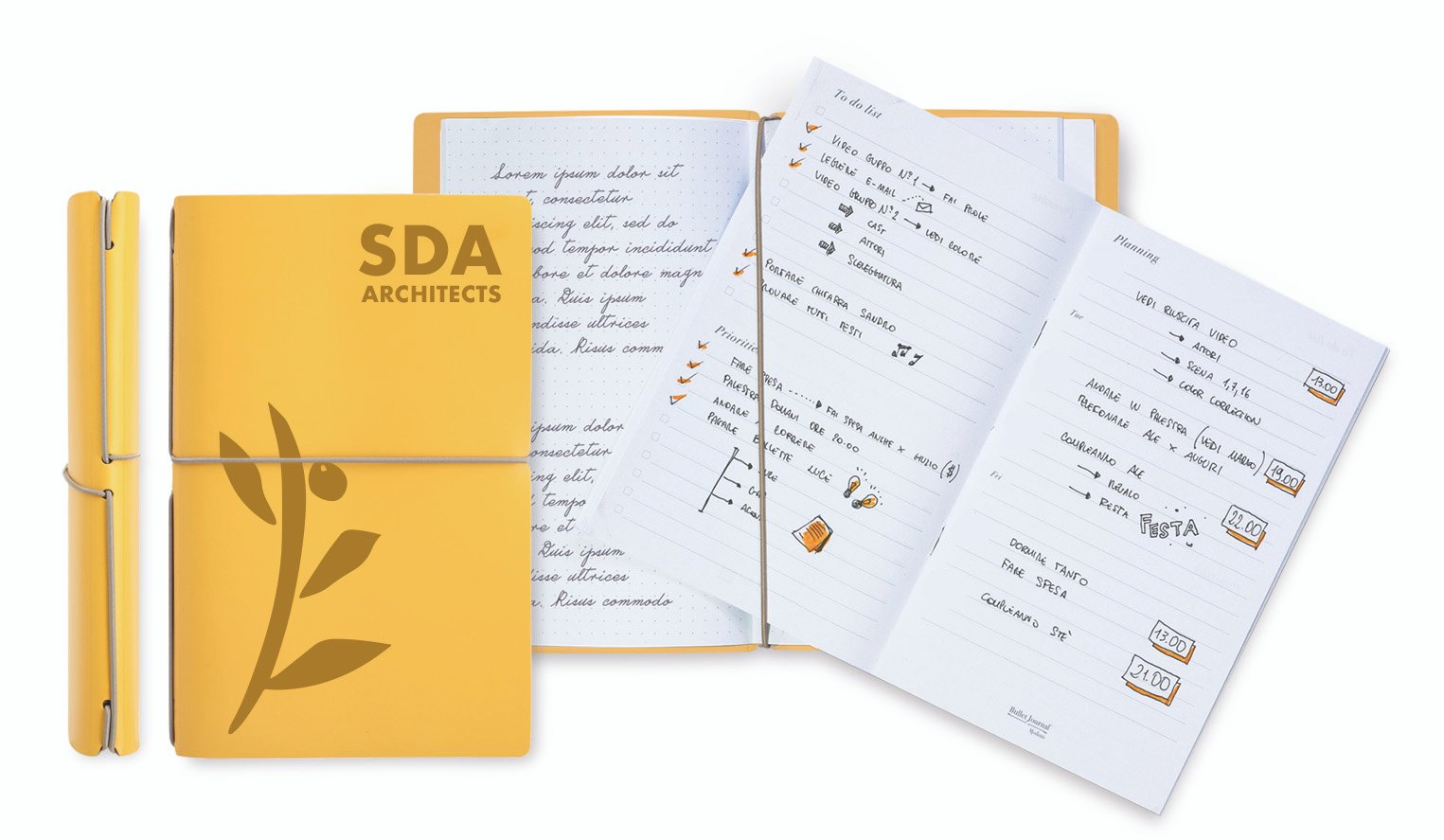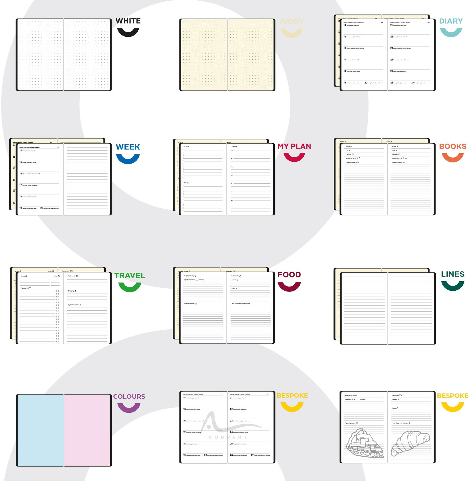 • Options: Elastic band available in many colours to coordinate with your brand identity, plus the possibility to develop custom printed inner layouts tailored to your company or campaign.